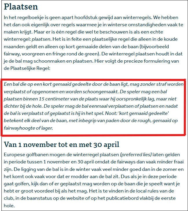 Wij adviseren om op de fairways overal en altijd te plaatsen of op te teeën. Zie hier of op prikbord in entreehal, meer informatie, uitleg en de exacte + officiële regel die van toepassing is. Deze regel is alleen van kracht als naast publicatie van deze Regel op het mededelingenbord (binnen) ook op het mededelingenbord buiten bij de ingang is aangegeven dat de Winterregel 'plaatsen' van toepassing is.