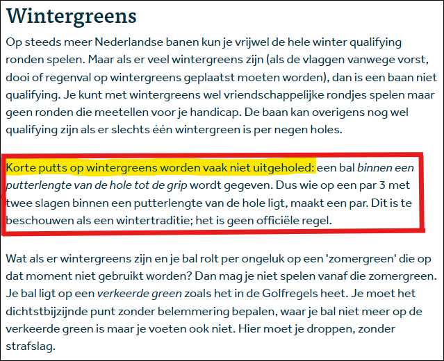 Dit is dus niet op een speciaal gemaaide winter-green o.i.d. Dit is een bewuste keuze en visie omdat wij er namelijk altijd naar streven, mits de weergoden + temperaturen en dus baanomstandigheden het toelaten, om de vlaggen 'gewoon' zo snel en zo vaak als mogelijk op de reguliere greens te zetten. En dan blijkt in de praktijk en over het algemeen, dat op deze manier het spelplezier het grootst is. - Wij adviseren om dan de bal binnen 1 stoklengte vanaf deze wintercup op te rapen.