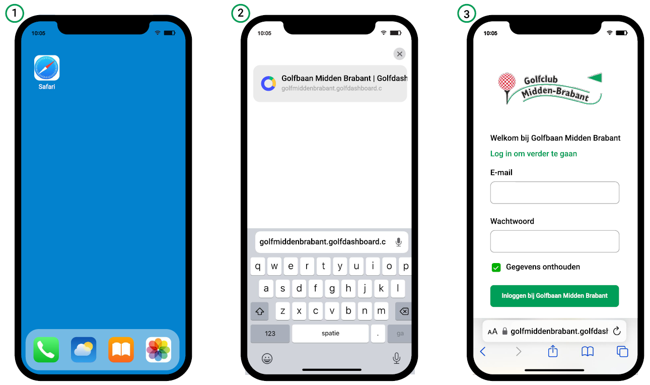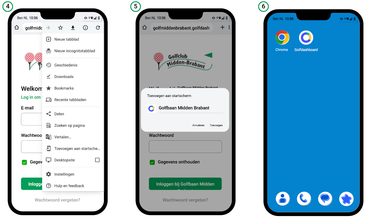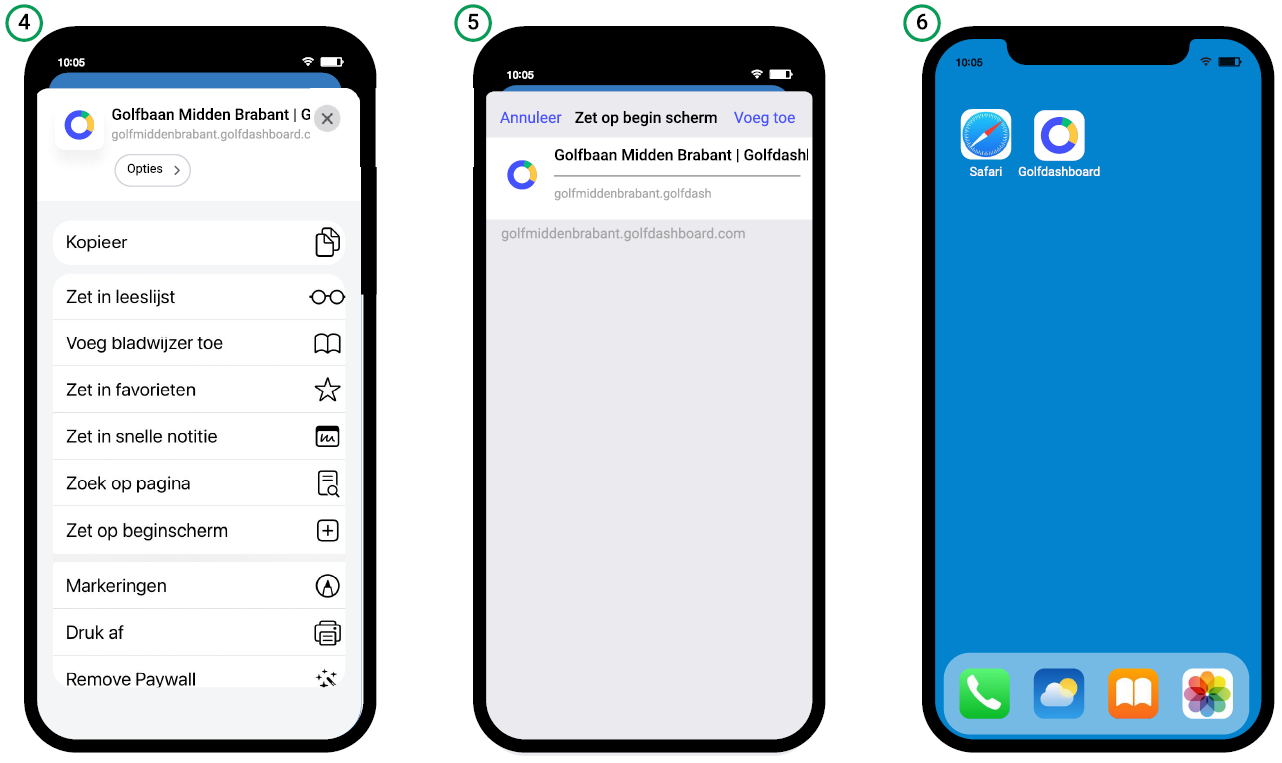 Ga als volgt te werk als je de Golfdashboard App als snelkoppeling op je startscherm wilt zetten: