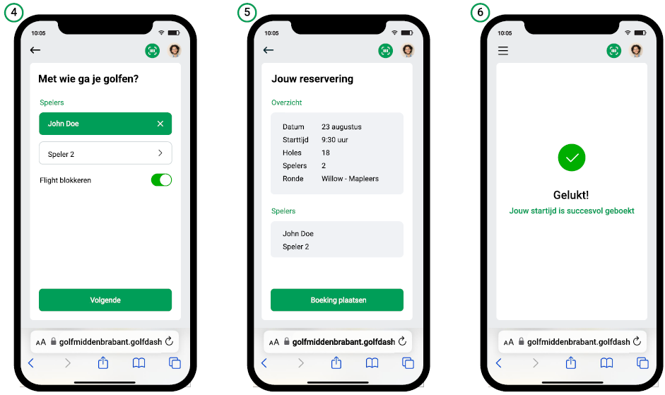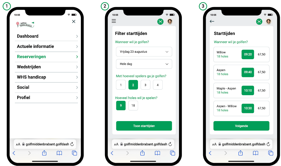 2. Kies de: datum, het dagdeel, het aantal spelers en het aantal holes en druk op "volgende".
