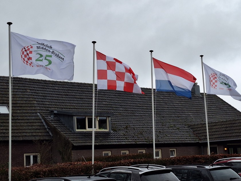 - Langs de N269 weg wordt het voorbijrijdend verkeer door de vlaggen bij hole 11 opmerkzaam gemaakt op ons jubileum;