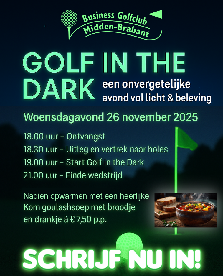 Op woensdagavond 26 november toveren we onze golfbaan om tot een magisch verlichte arena. Geen gewone wedstrijd dit keer — maar een bijzondere ronde in het pikkedonker, met lichtgevende golfballen, holes en markers. Een belevenis die je niet wilt missen!