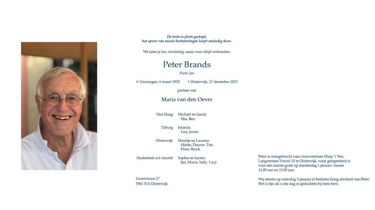 Wij ontvingen het bericht van overlijden van ons gewaardeerde lid Peter Brands