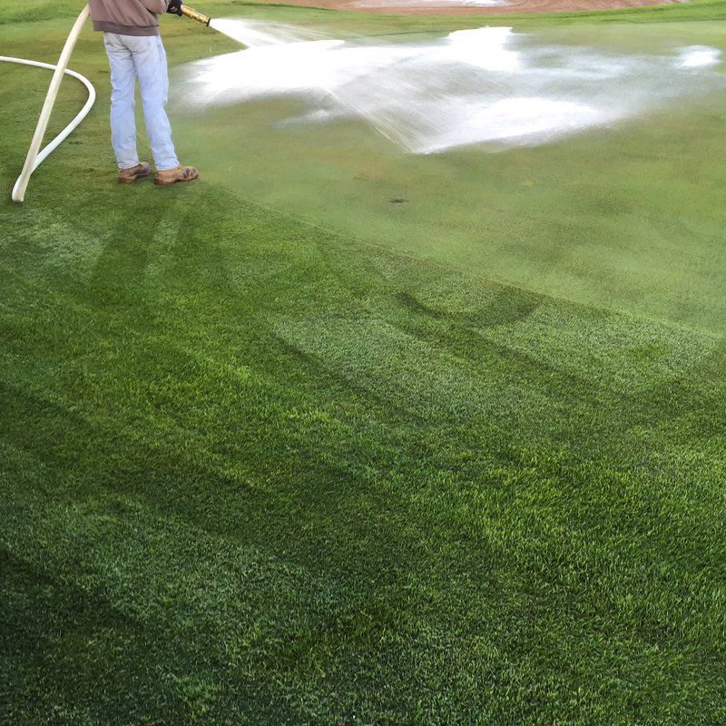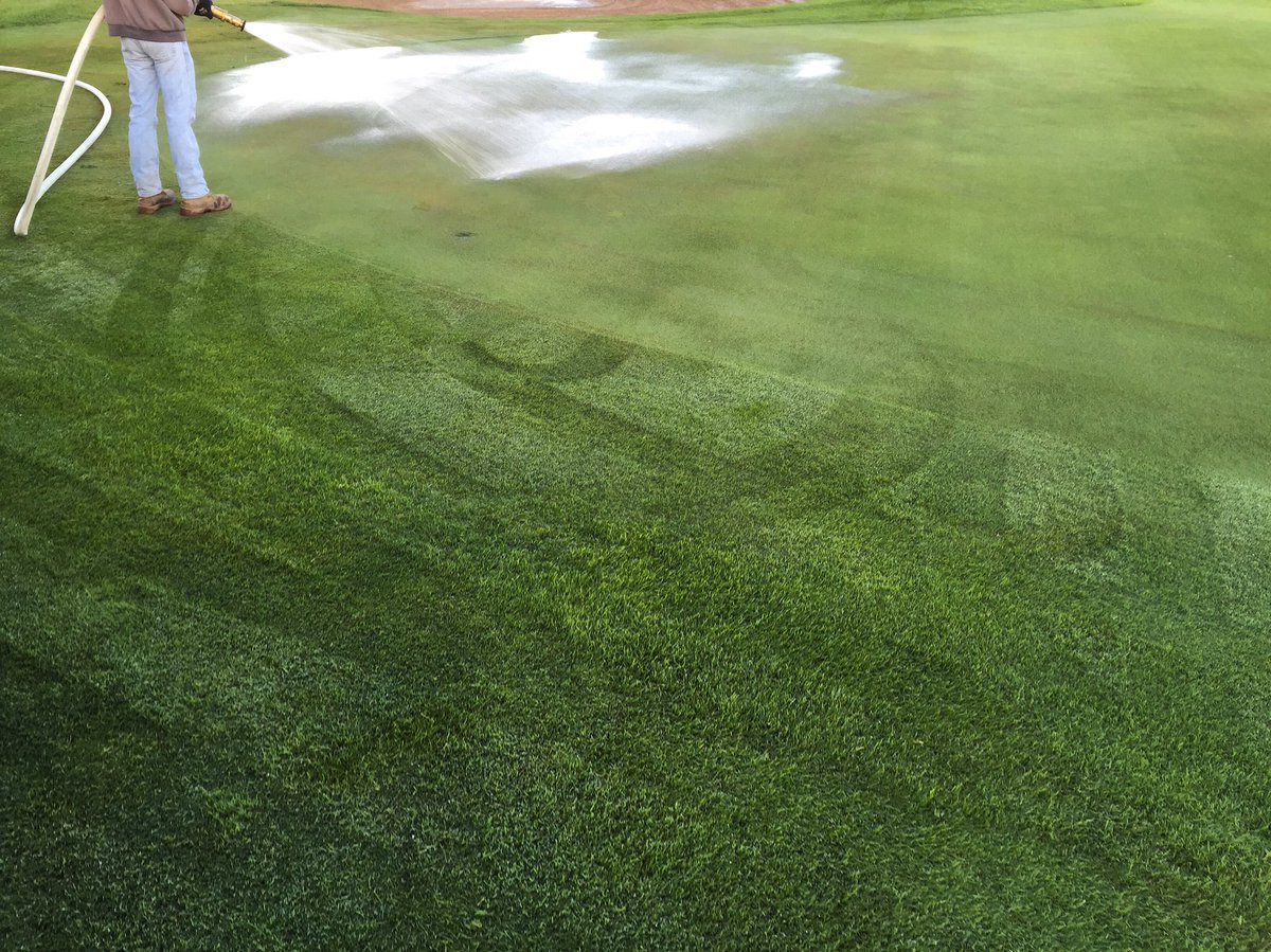 Maar er is aangetoond dat door bepaalde wetting agent te gebruiken het waslaagje kan worden doorbroken. De gebieden waar zo'n waslaagje rond de zandkorrels is zijn meestal droger. U kunt het vergelijken met druppels op uw auto die net gewaxt is. Deze gebieden gaan de greenkeepers dan extra water geven. Door regelmatig dit product te spuiten proberen we de vochtigheid in de bodem over de gehele green gelijk te krijgen. Wetting agent spuiten we vooral preventief 1 keer in de maand in het groeiseizoen. Na deze bespuiting zetten we de beregening op om het product van het blad te spoelen en een goed contact met de bodem te verzekeren.