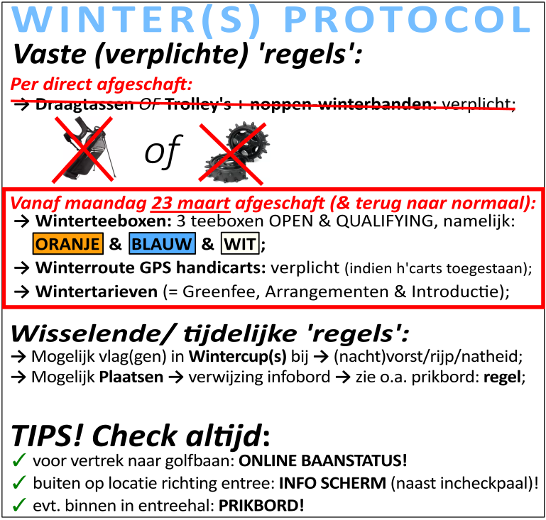 Op 23 maart gaan alle teeboxen weer open. Je kunt dan weer vanaf alle (kleuren) teeboxen afslaan! "Kies je Tee" van de NGF blijft belangrijk om snelheid in je spel te houden, maar vooral ook PLEZIER in je spel. Zie afbeelding hieronder wat als leidraad of advies kan gelden vanuit de golfbond. Maar je bent vrij om elke kleur Tee te kiezen: kies er één die bij je past (lengte van je slag en dan vooral je balvlucht afstand) en kies niet op advies van je flightgenoten of je geslacht.